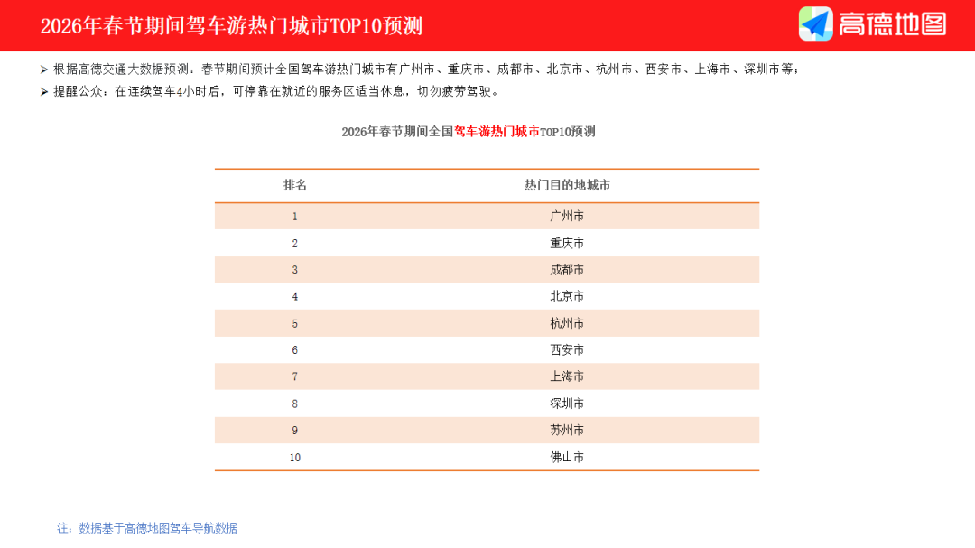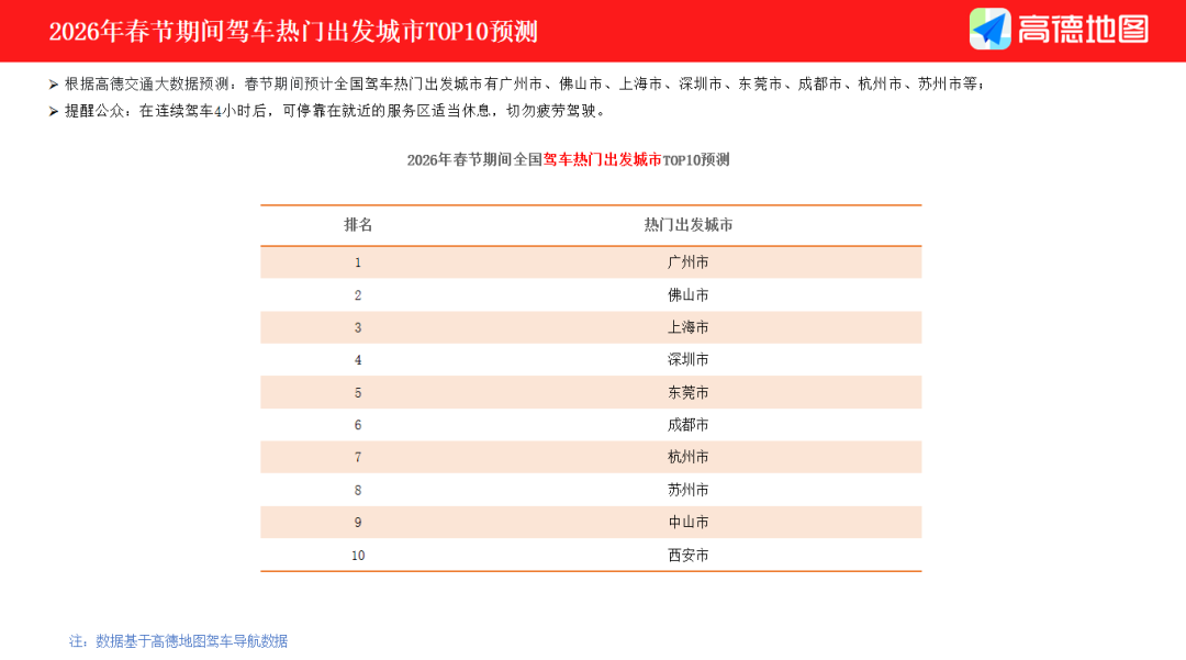 春运从来不只是“返乡团圆”,也藏着“旅行过年”的新选择。报告显示,今年春运,全国驾车热门出发城市TOP10中,广州、深圳、佛山三座广东城市强势上榜,广东也成为上榜城市最多的省份。