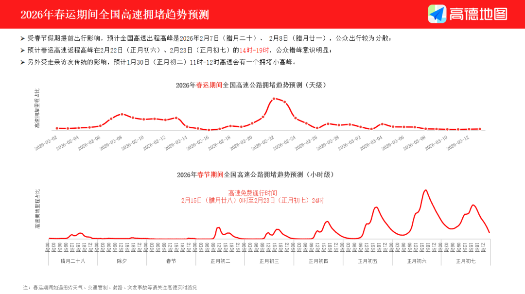 节前全国高速去程高峰锁定2月7日(腊月二十)、8日(腊月廿一),节后返程高峰则集中在2月22日、23日(正月初六、初七)下午;而受传统走亲访友习俗影响,正月初二(2月18日)中午还将出现一波短暂的拥堵小高峰,成为春运中的“小插曲”。